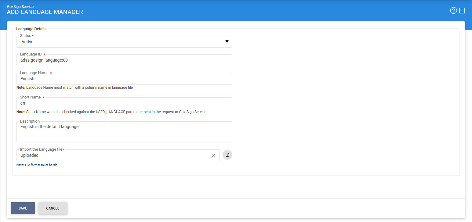 It is used to import the excel sheet required for a language. By default ADSS server will maintain an Excel based English language file in setup>lang folder. When setup installs the ADSS server, it also reads the default language file under setup>lang folder and saves it in DB. This default language file is registered as English language when the ADSS Server is freshly installed. |