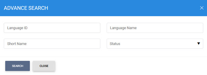 This helps to locate a particular type of language. The language can be searched based on Language ID, Language Name, Short Name and status. If a search is based on multiple values, then these will be combined together using the “AND” operand, and thus only records that meet all the criteria will be presented.