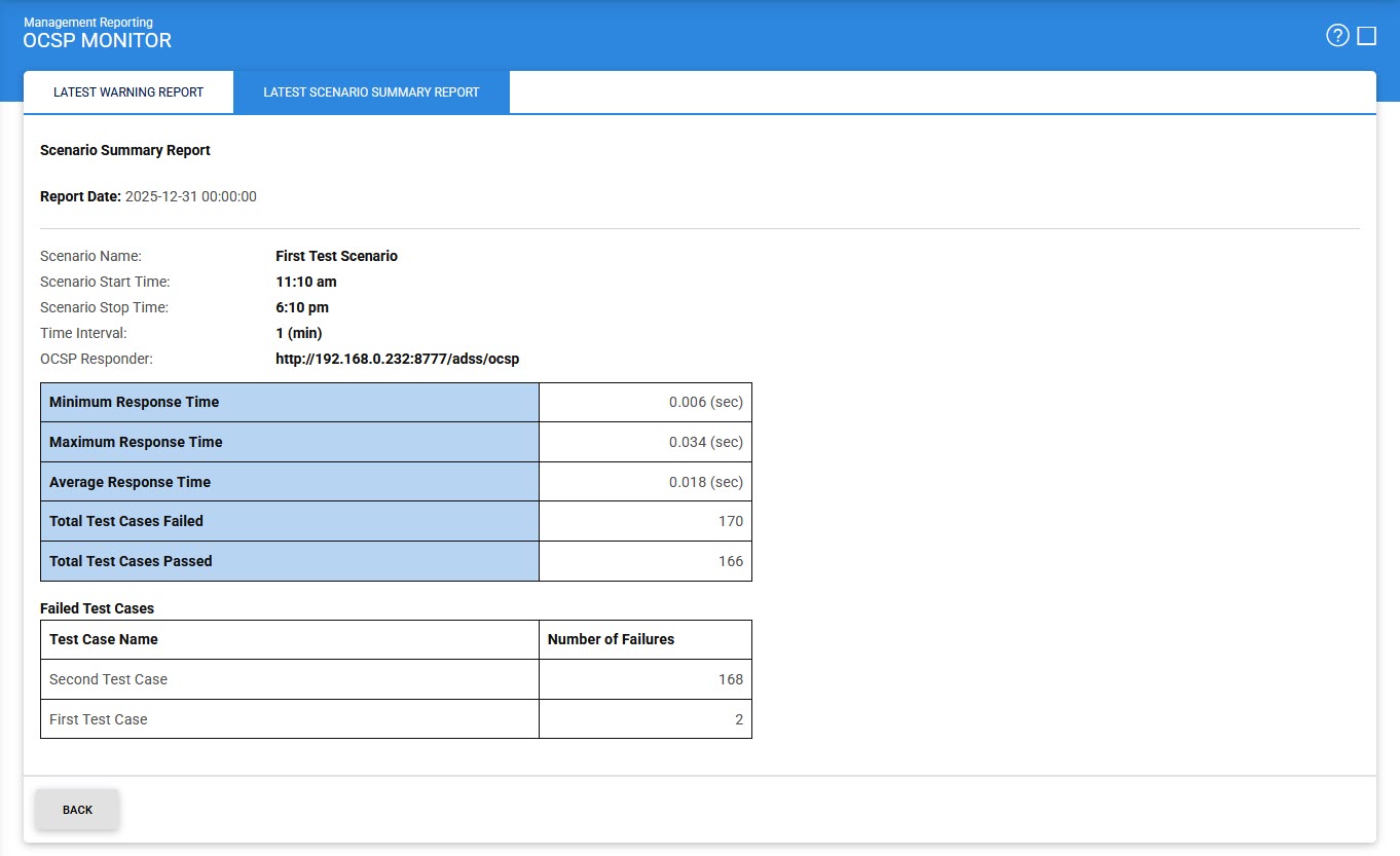Management ReportingOCSP Monitor Latest Scenario Summary Report By selecting the Latest Scenario Summary Report link from the top of the page the following screen will be shown: See also Latest Warning ReportLatest Scenario Summary Report