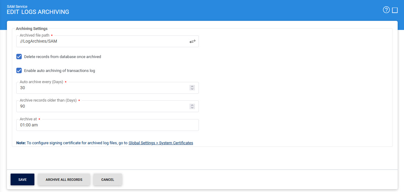 The integrity of archived logs can also be preserved by signing the archived log file using a Log Signing key, this configuration is available within the Global Settings > System Certificates module.