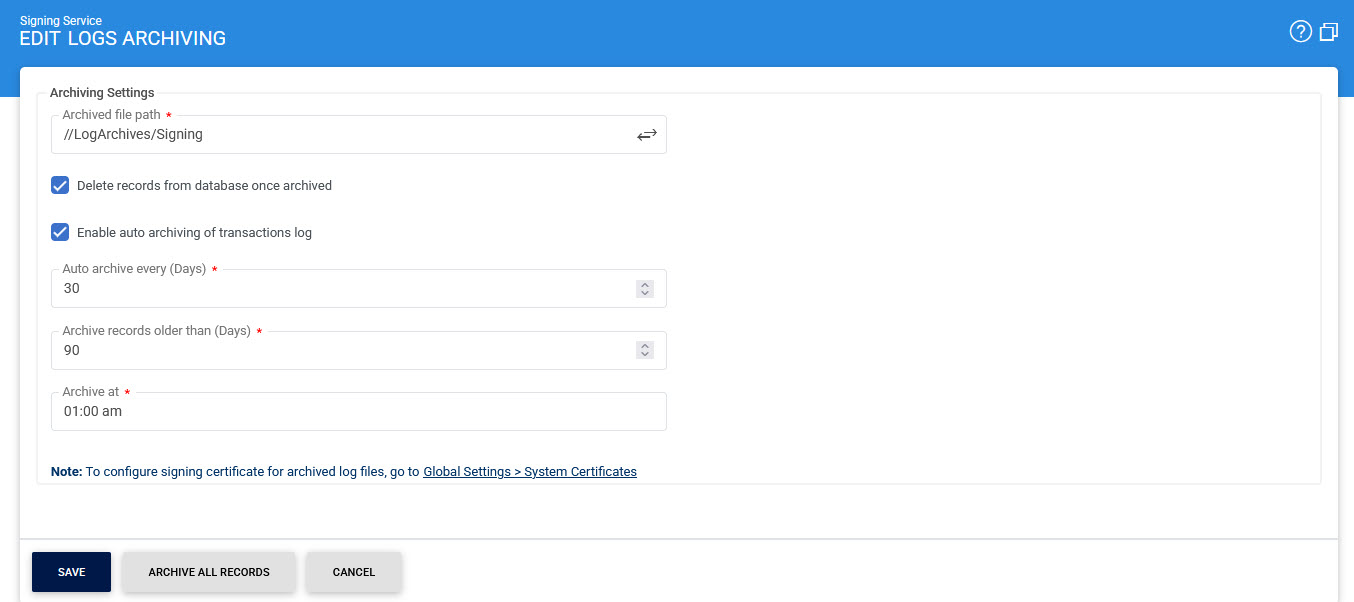 The integrity of archived logs can also be preserved by signing the archived log file using a Log Signing key, this configuration is available within the Global Settings > System Certificates module: