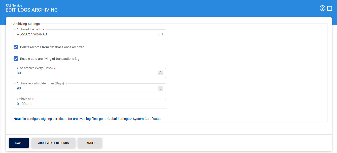 The integrity of archived logs can also be preserved by signing the archived log file using a Log Signing key, this configuration is available within the Global Settings > System Certificates module.