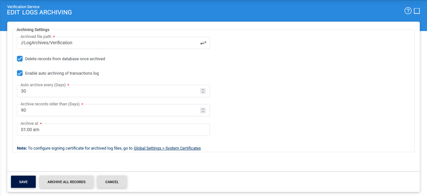 The integrity of archived logs can also be preserved by signing the archived log file using a Log Signing key, this configuration is available within the Global Settings > System Certificates module.