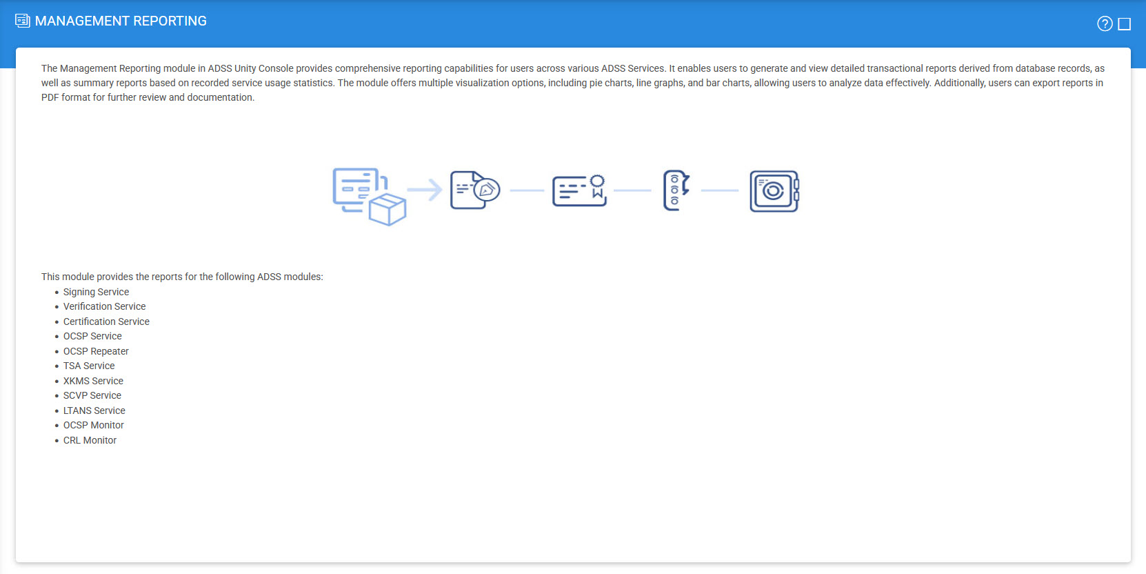 The Management Reporting module in ADSS Unity Console provides comprehensive reporting capabilities for users across various ADSS Services. It enables users to generate and view detailed transactional reports derived from database records, as well as summary reports based on recorded service usage statistics. The module offers multiple visualization options, including pie charts, line graphs, and bar charts, allowing users to analyze data effectively. Additionally, users can export reports in PDF format.