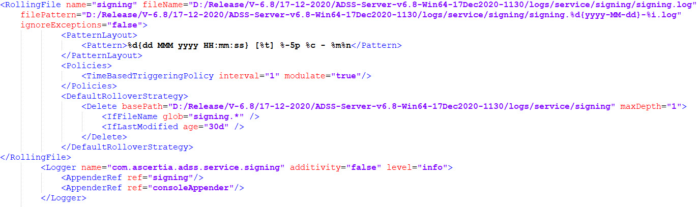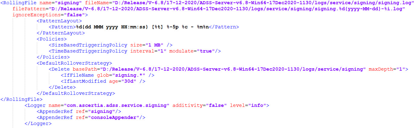 filePattern = %ADSS_INSTALLATION_DIR%/logs/service/signing/signing.%d{yyyy-MM-dd}-%i.log Defines the pattern of the file name of the archived log file. The format of the pattern should dependent on the RolloverPolicy that is used. The DefaultRolloverPolicy will accept both a date/time pattern compatible with SimpleDateFormat and and/or a %i which represents an integer counter. The pattern also supports interpolation at runtime so any of the Lookups (such as the DateLookup can be included in the pattern. |