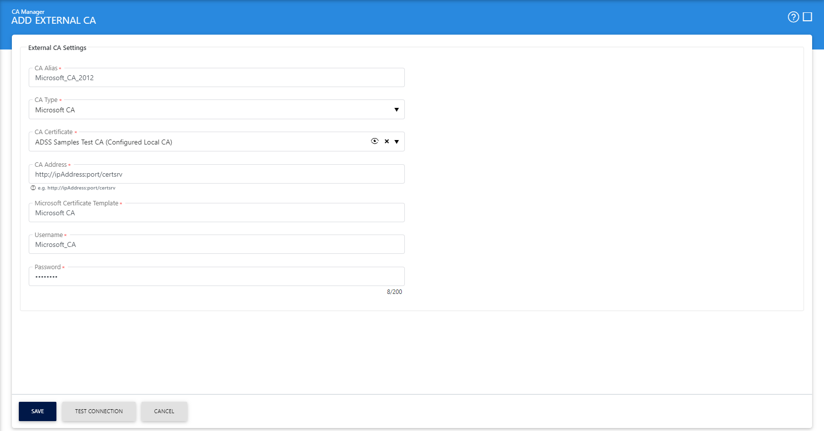To configure the Microsoft CA as an external CA select the Microsoft CA from the CA Type drop down. The following page will be shown to configure the Microsoft CA: