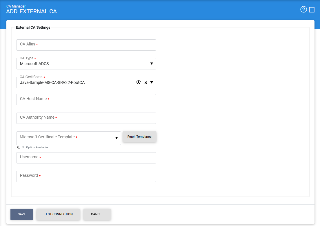 To configure the Microsoft Active Directory Certificate Services as an external CA, select the Microsoft ADCS from the CA Type drop down. The following page will be shown to configure the Microsoft ADCS: