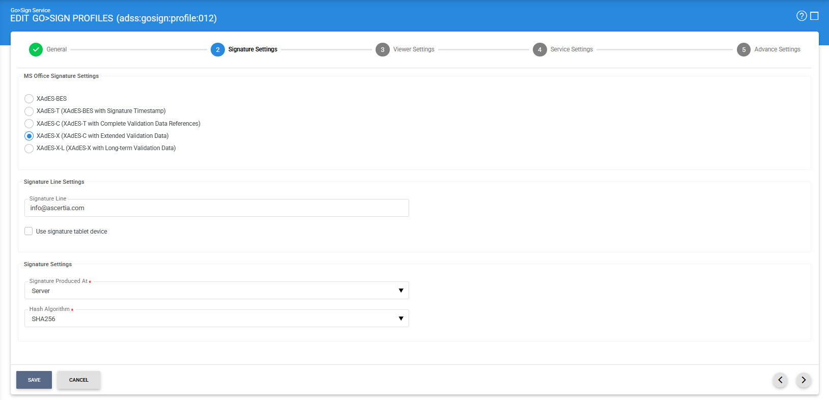 Select the MS Office (XAdES) signature type that will be produced by this profile.See the Supported Signature Types section for more details for the types of signatures supported by Go>Sign Service. |