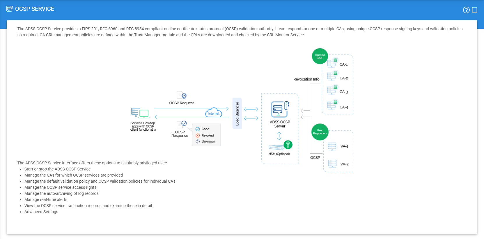 ADSS OCSP Service is an advanced implementation of Online Certificate Status Protocol (OCSP) that provides revocation status information for x.509 certificates, based on either CRLs or real-time certificate information. It is a validation authority, which is fully compliant to the IETF RFC 6960 and RFC 8954 and partially to RFC 5019 standards (to support client side caching). ADSS OCSP Service can be configured to provide revocation status of digital certificates issued by multiple CAs, defined within the Trust Manager.
