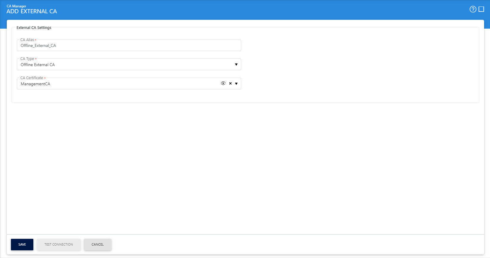 Select the option Offline External CA, if it is required to do server side signing with the keys that are already issued by an external CA which is not registered within ADSS Server. |