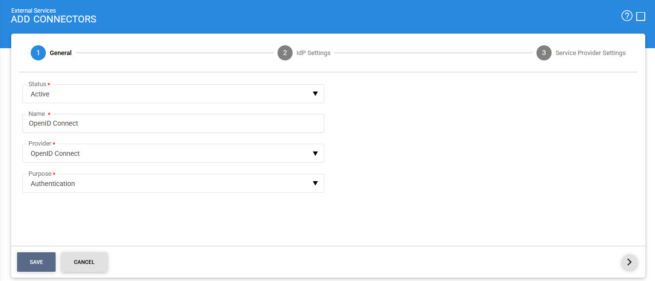 This drop-down field specifies the type of IdP used for the Connector. Select OpenID Connect to configure an OpenID Connect based IdP. |