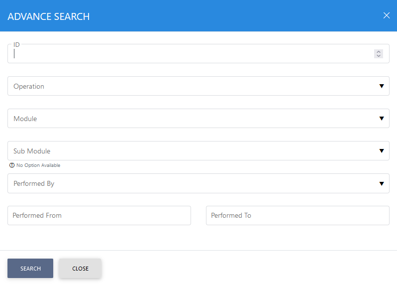 Clicking the Advance Search button displays the following screen allowing a search for a particular log record: