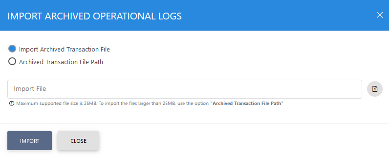 Use this option to browse the archived log file in zip format from the user machine. By using this option the archived log file is uploaded on the ADSS Server. It can be an expensive operation if the file is of large size so the user is allowed to upload a file with maximum size up to 25 MB. Use the archived file path option for files bigger than 25 MB. |