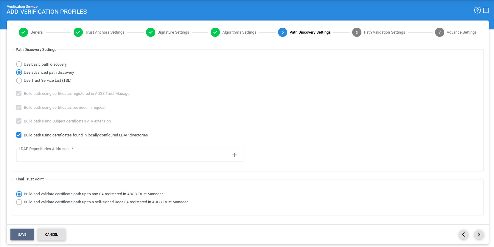 Select this option if you want the path discovery using configured LDAP repositories. Configure the LDAP repository address(es) from where the intermediate certificates can be found. Note: The Root CA must be registered in ADSS Trust Manager if you want path discovery using LDAP repositories. |