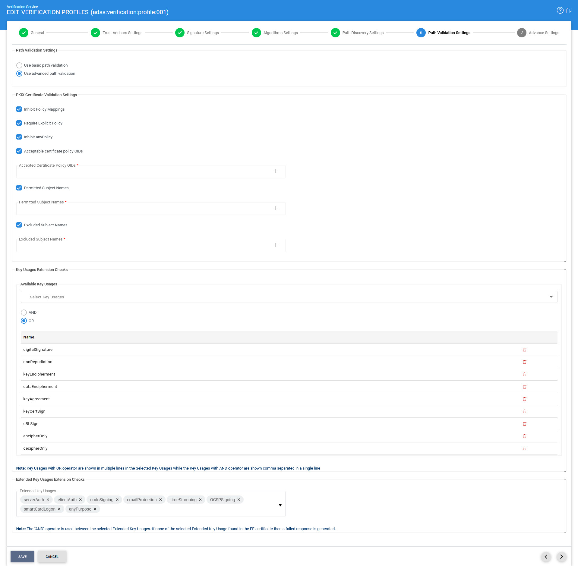 Path Validation Settings determine how the certificate chain (prepared via Path Discovery) will be validated.