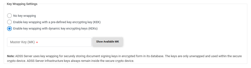 When "Enable key wrapping with dynamic key encrypting keys (KEKs)" radio button is enabled the system generates a dynamic KEK for each private key by using the selected master key, password and a server based salt value. This dynamic KEK will be used to wrap and unwrap the private key. Once the private key gets wrapped, the system will save the wrapped key in the database and delete the private key from the HSM as well as the Dynamic KEK. When a server-based signing operation is requested the ADSS Server generates a dynamic KEK. This is done by using the selected master key, user password and server salt. At the time of signing, the private key is imported into the HSM and unwrapped and decrypted using the dynamic KEK. After signing the private key is kept in the crypto device for the configured time period and then deleted. This time period is defined by the property UNWRAPPED_KEY_CACHE_INTERVAL configurable at location: [ADSS-Server-Console]/Global Settings > Advanced Settings under General Property type. After signing the dynamic KEK is also deleted from the HSM. |