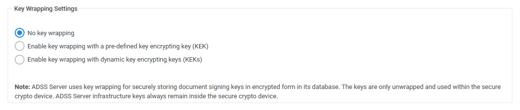 Select "Enable key wrapping with a pre-defined key encrypting key(KEK)" radio button option if you wish to enable key wrapping for the configured crypto device. The key wrapping functionality only works if the underlying crypto device supports this and already has a suitable KEK. |