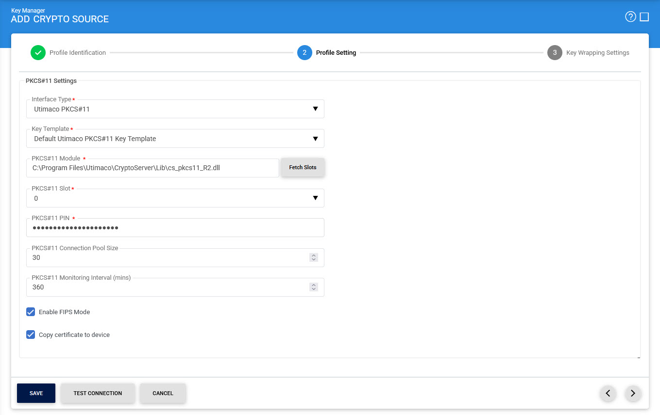 This drop-down will allow the user to select the interface type for the required crypto source vendor i.e. either CC or PKCS#11. |