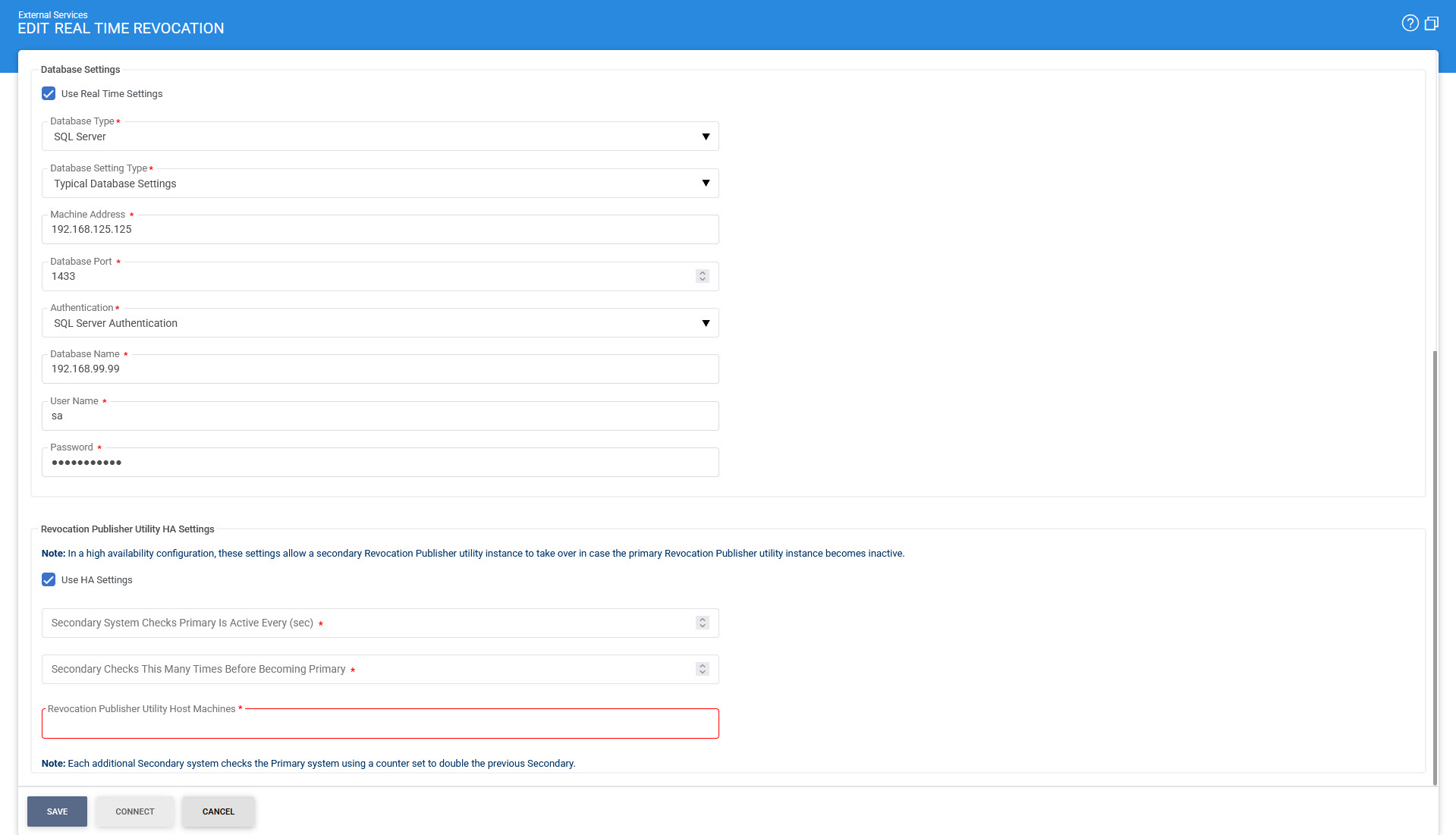 For the Revocation Publisher Utility HA Settings option, once a successful connection is established with the database, a success message will be shown and the HA Setting fields will be populated with the default values and the machine name on which the RPU is installed. High Availability (HA) configurations of RPU work similarly to HA configurations of CRL Monitor. To get more information about HA configuration click here.