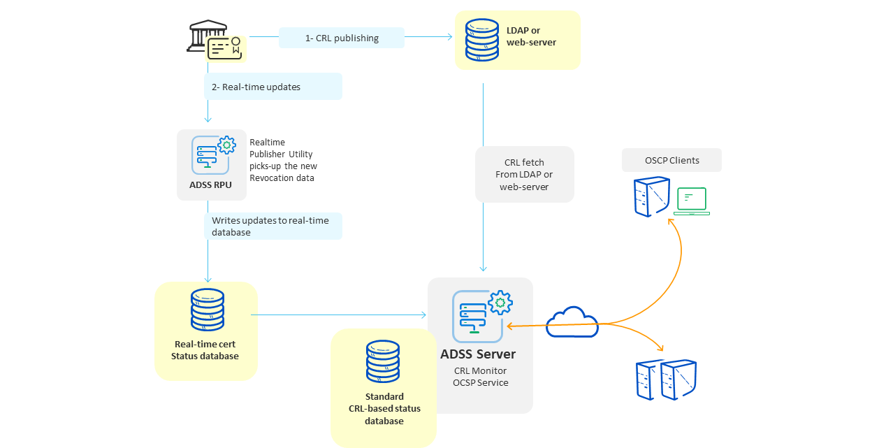 With this up-to-date information on certificate revocation information in place, ADSS Server can provide real-time information on certificate revocation status. The process flow is as follows: