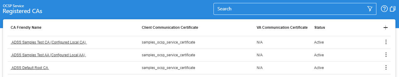 OCSP services are provided only for those CAs which are registered within the ADSS OCSP Service. This is in addition to their registration within the ADSS Trust Manager since the ADSS Trust Manager is used as a general store of trust anchors for any purpose. A CA can be added using the Registered CA option within the ADSS OCSP Service GUI.