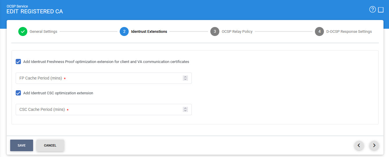 If selected, the FP (Freshness Proof) extension is included in the OCSP Response. If enabled, the OCSP service will poll for FP Responses. FP Cache Period is the time period after which OCSP service will poll for FP responses from the IdenTrust Root. This extension should normally be only used within the Identrust PKI environment for optimisation purposes. |