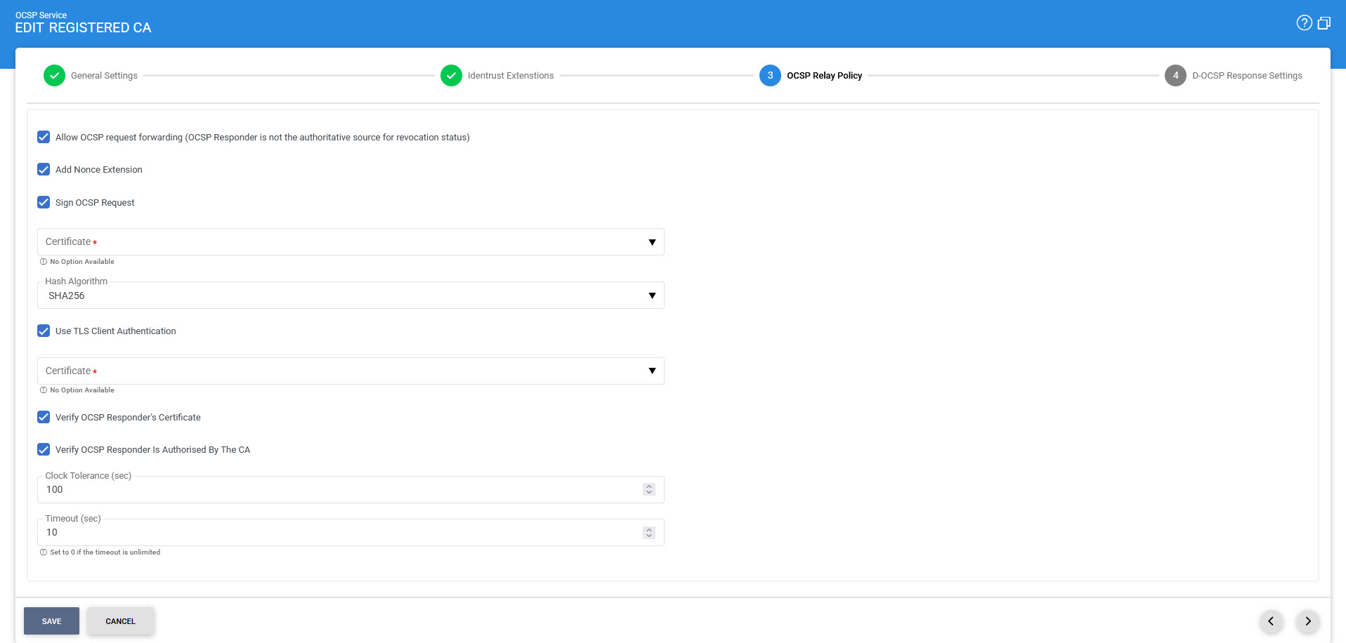If this option is enabled then OCSP service will communicate with peer OCSP responder using TLS client authentication. Select the Client TLS Certificate which pre-exists in the Key Manager. Note: It is required to register the Issuer CA of the Client TLS certificate in Trust Manager with the CA for verifying TLS client certificates purpose |