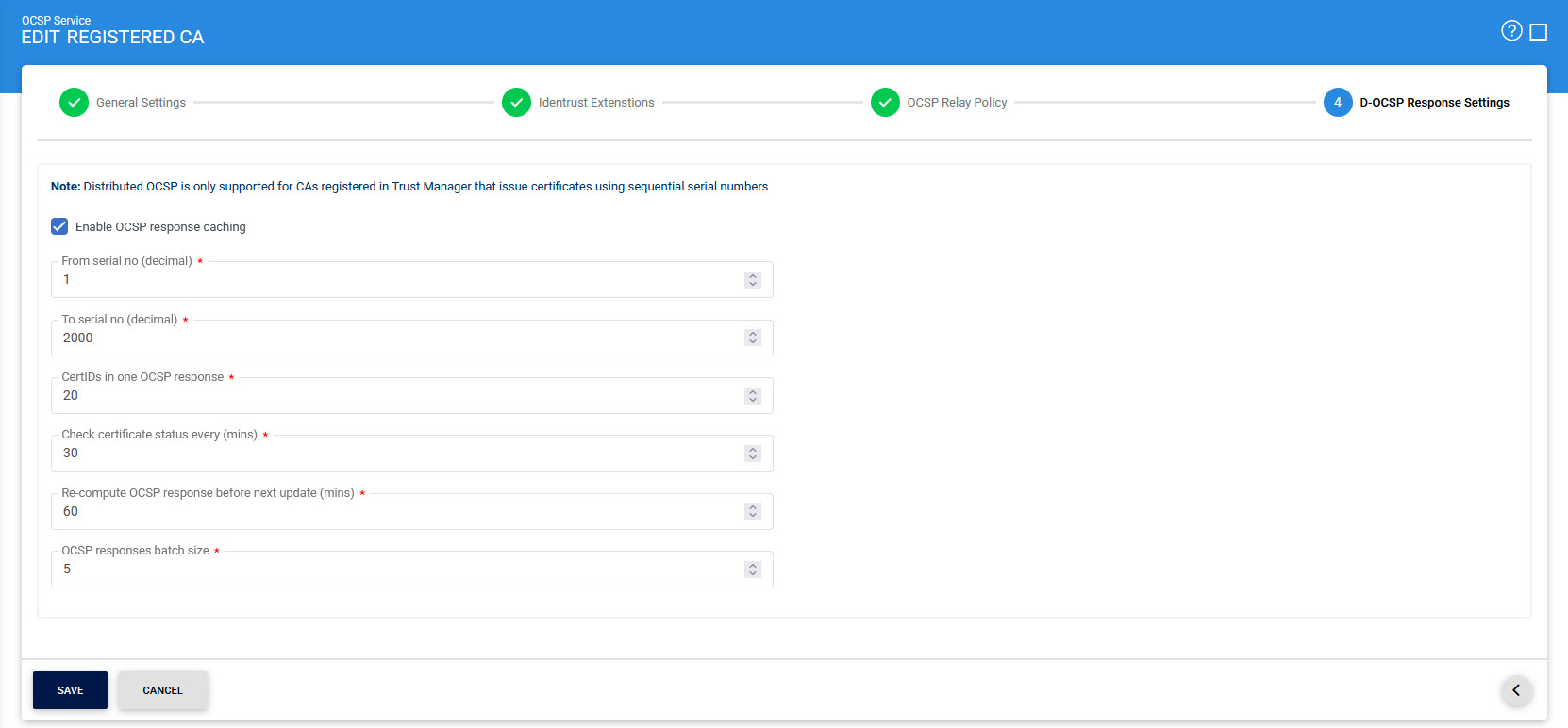 The Distributed OCSP Response settings are defined in the following screen: