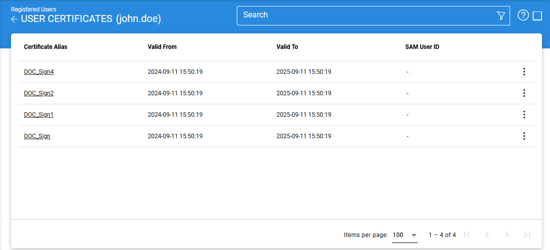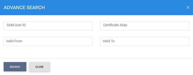 The User Certificates can be searched based on their “SAM User ID”, “Certificate Alias”, “Valid From” and “Valid To”. If a search is based on multiple values, then these will be combined together using the “AND” operand, and thus only records that meet all the criteria will be presented.