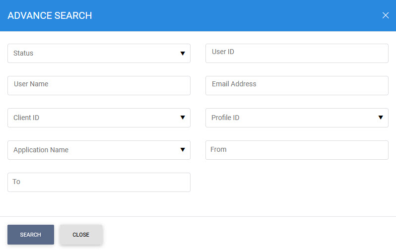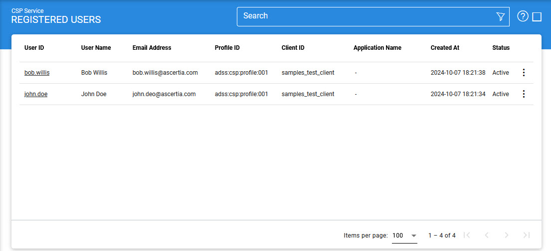 The Users can be searched based on available filters i.e. "Status", "User ID", "User Name", "Email Address", "Client ID", "Profile", "Application Name", "Created At From" & "Created At To". “Create At From” and “Created At To” fields define the range when users were registered in CSP Service. If a search is based on multiple values, then these will be combined together using the “AND” operand, and thus only records that meet the filtered criteria will be displayed.