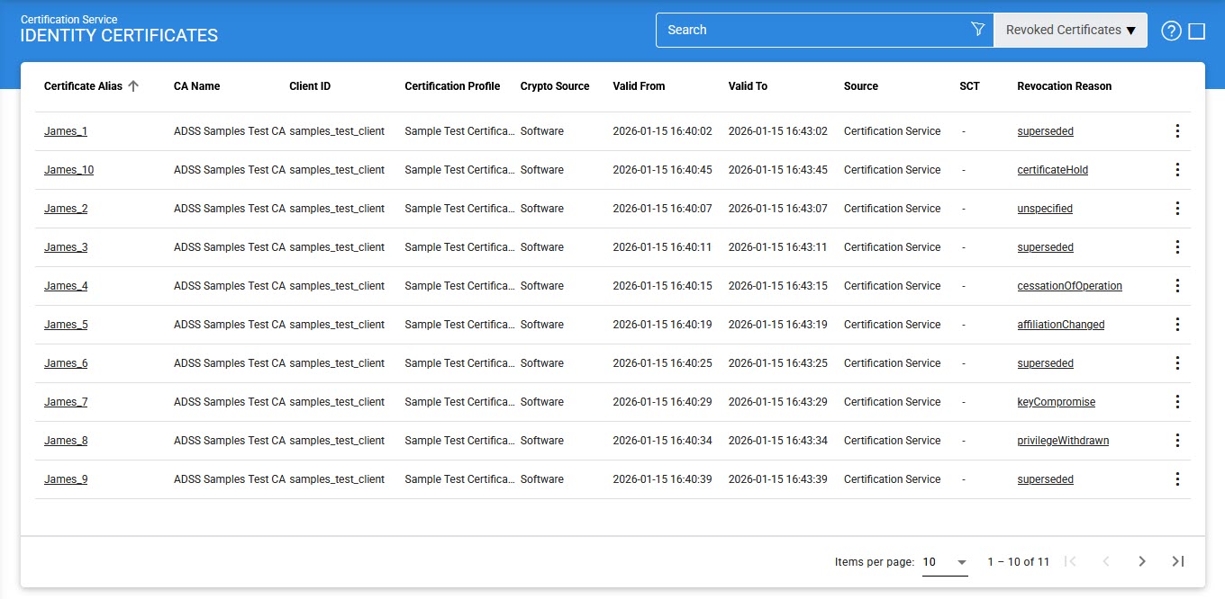 The Revoked Certificates navigation button within the ADSS Certification Service allows you to view all the revoked certificates as mentioned below: