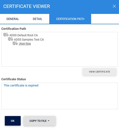 Here the user can view all the configurational details related to the selected revoked certificate. Clicking on the Certification Path displays the following screen: