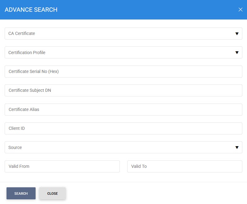 Clicking on the Advanced Search icon on the Certification Service >> Revoked Certificates main page will display the following screen: