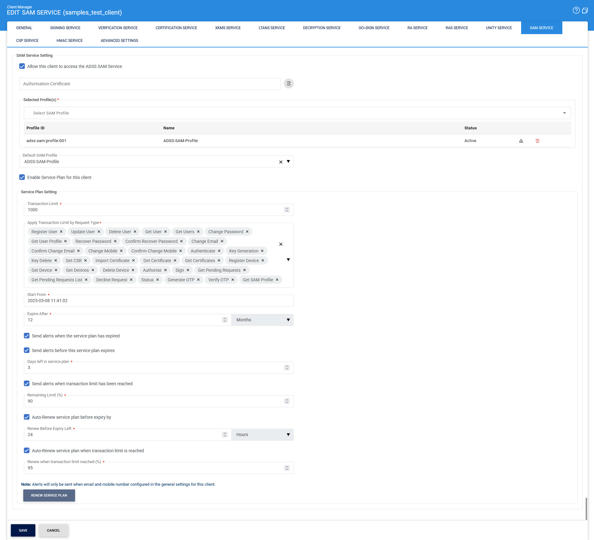 Allow this client to access the ADSS SAM Service |
