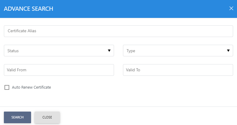 This helps to locate a particular type of certificate the Key Manager service may have issued. The certificate can be searched based on certificate alias, status, validity period or type. If a search is based on multiple values, then these will be combined together using the “AND” operand, and thus only records that meet all the criteria will be presented.
