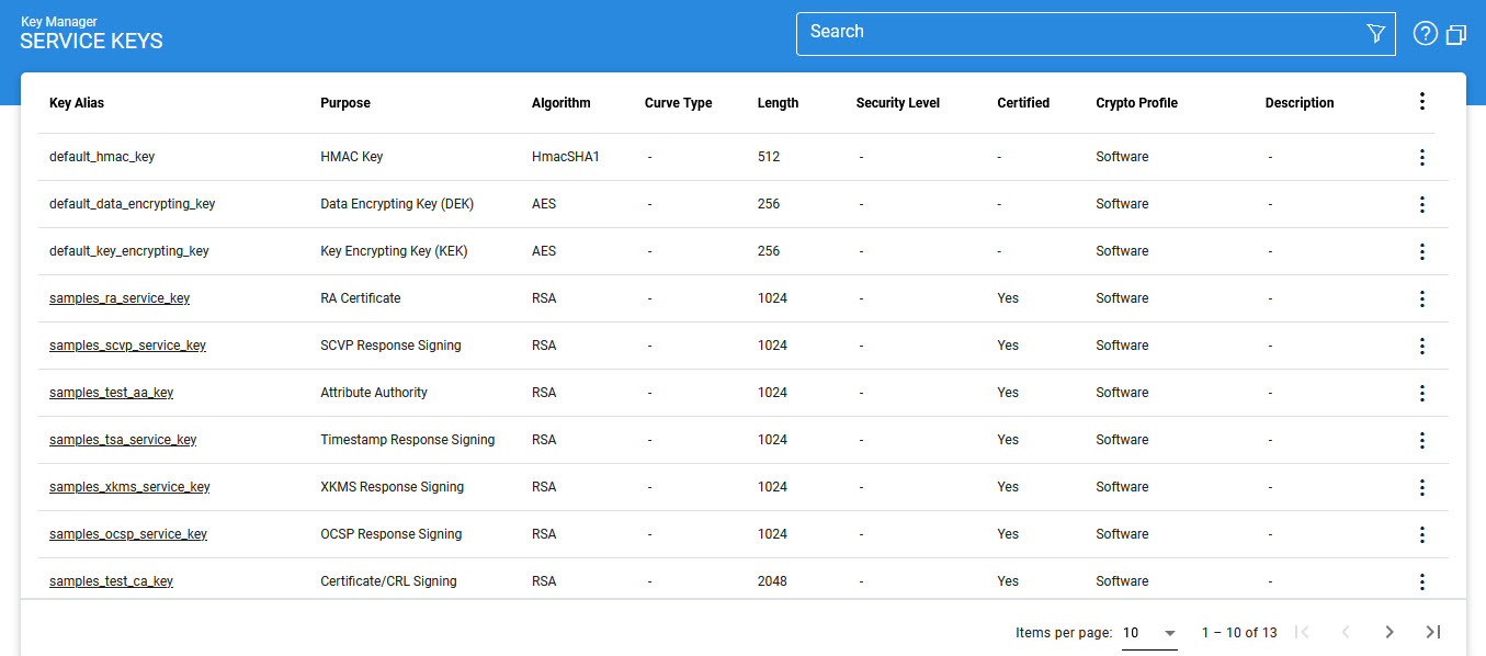 The Infrastructure/service keys that are configured in ADSS Server to perform its operations are managed by the Key Manager > Service Keys module. To access the Service Keys module, click on the Service Keys link. The next screen shows all keys created by ADSS Server users using Key Manager: