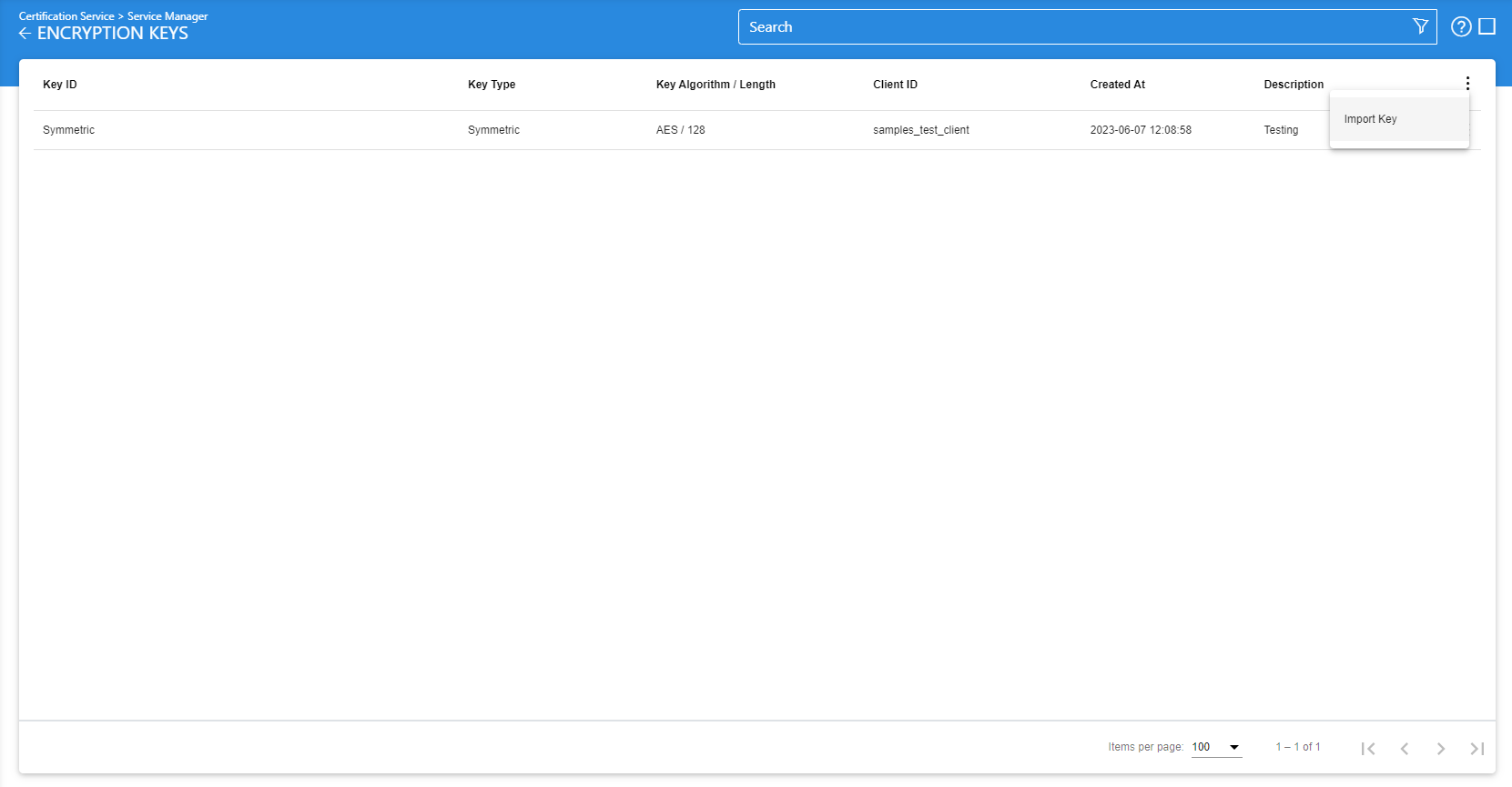 This helps to locate an encryption key that the Certification Service may have issued. Encryption Keys can be searched based on Alias, Key Type, Key Length and Client ID. If a search is based on multiple values, then these will be combined together using the “AND” operand, and thus only records that meet all the criteria will be presented.