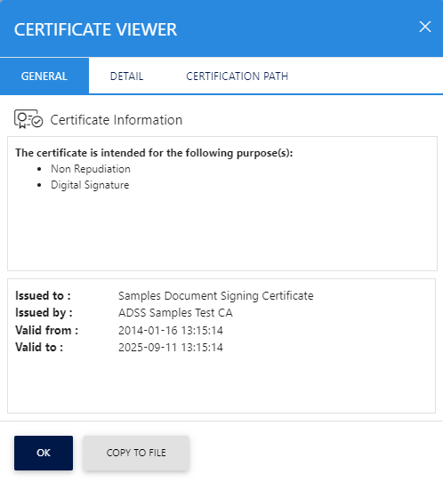 A list of certificates created with 'Document Signing' purpose will appear in the drop-down. The selected signing certificate will be used to sign the server generated private key bytes. These signed private key bytes are also known as CMS signed data. Note: In EST, the CMS signed data are required to transport the server-side generated private key. |