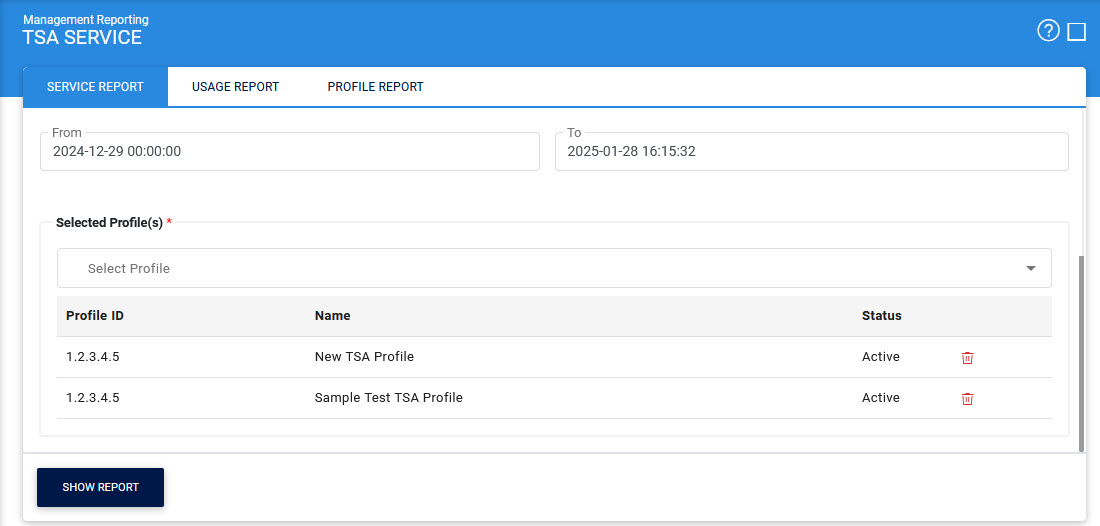 Select a particular TSA profile for which you want to see the statistics otherwise choose ALL option. By pressing the Show Report button the screen will be refreshed to show you the results concerning the number of success and failed transactions during that date range. |