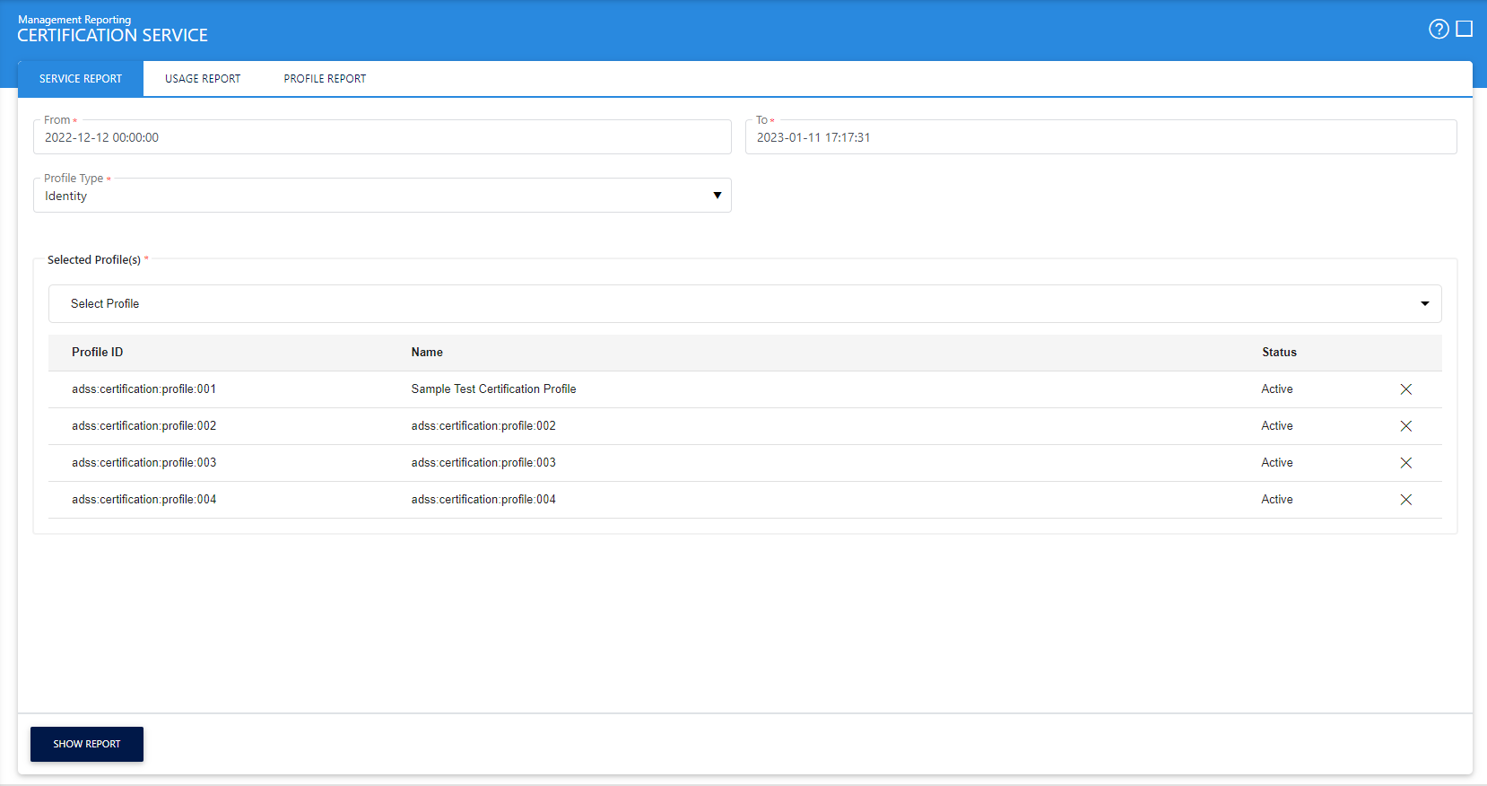 Select a particular certification profile for which you want to see the statistics otherwise choose ALL option. By pressing the Show Report button the screen will be refreshed to show you the results concerning the number of success and failed transactions during that date range. |