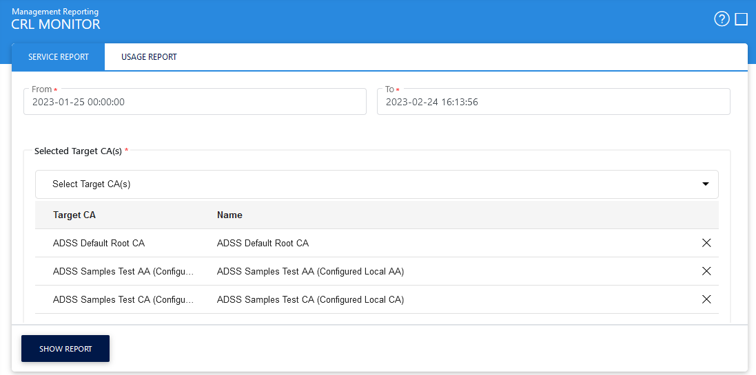 Select a particular target CA for which you want to see the statistics otherwise choose the ALL option. By pressing the Show Report button the screen will be refreshed to show you the results of the number of successful and failed transactions during that date range. |