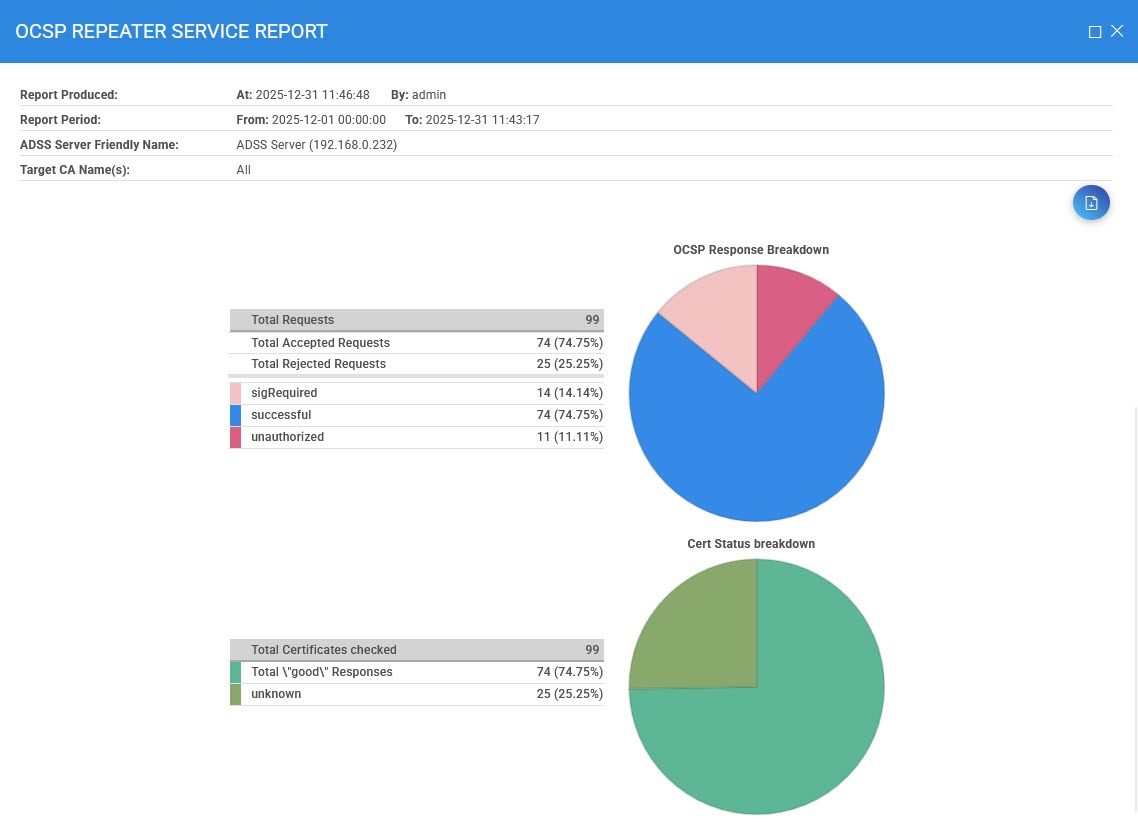 This Show Report button shows the number of OCSP Repeater requests received and the ones which were rejected (e.g. because they were unsigned).