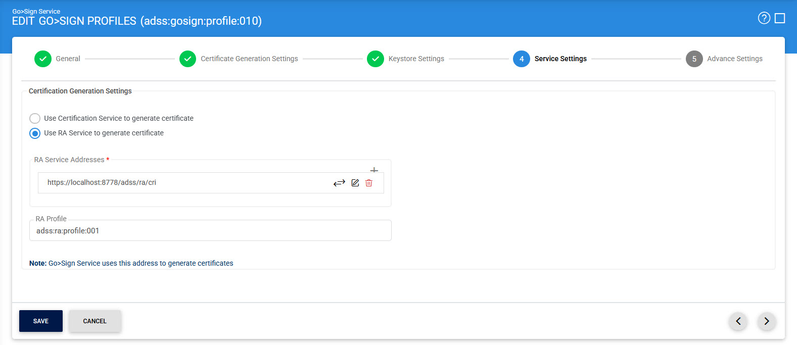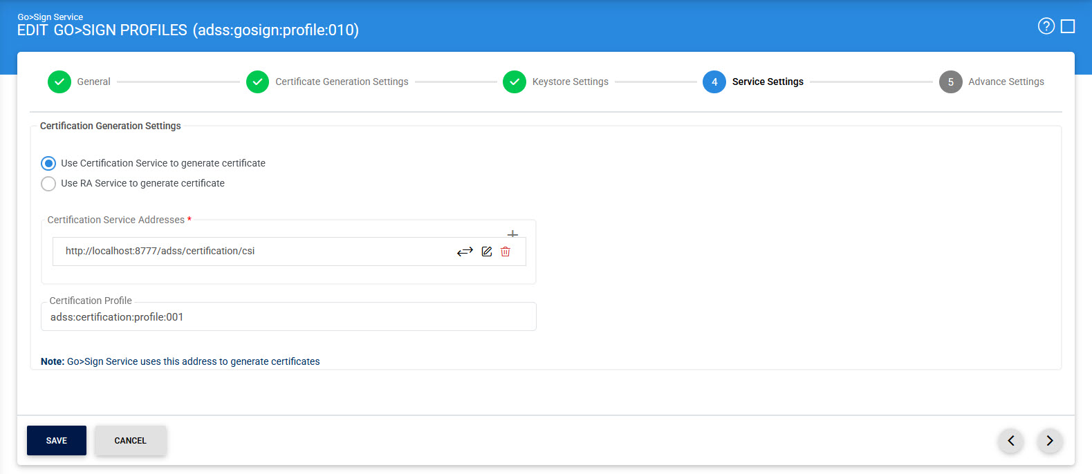 This page is used to configure the Certification Service or RA service by selecting the radio button that will be used to certify the keys generated through Go>Sign Desktop.