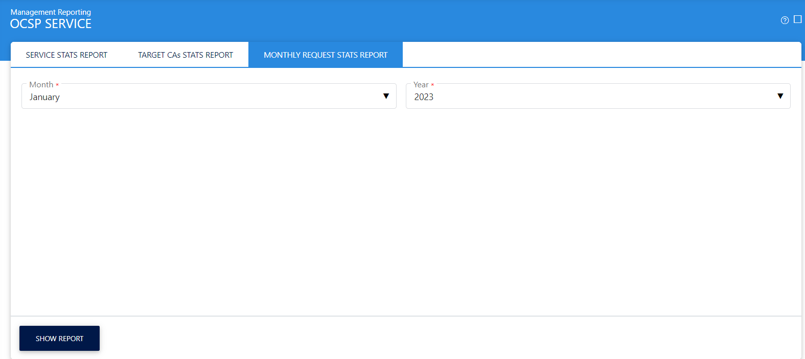This report allows you to view the requests received in a month. The Line Graph shows the monthly OCSP Service transactions per month and a year. Simply select "Month" and "Year" and press the Show Report button: