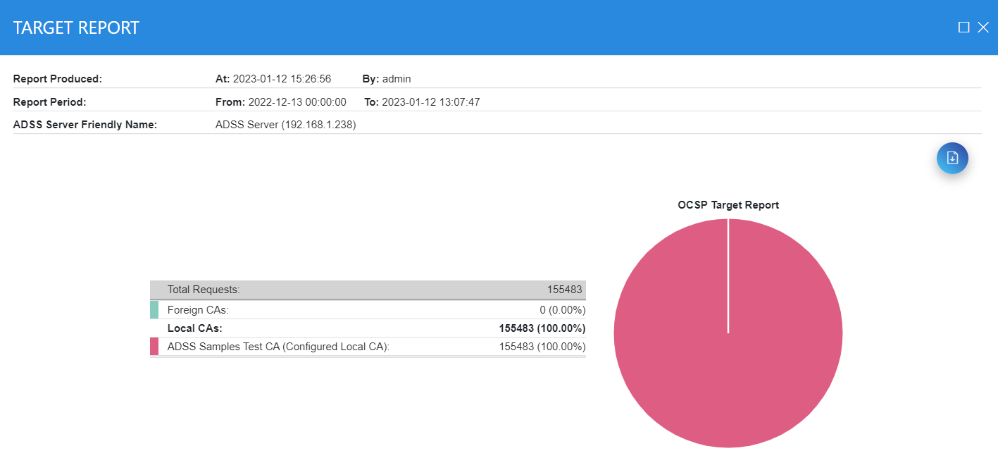 In this report the Foreign CA represents the fact the OCSP transaction was forwarded to a peer OCSP responder because the local OCSP service was not authoritative for the target CA. Hence these transactions are grouped together and shown under the category of “Foreign CAs”. This report can be exported as a PDF document.