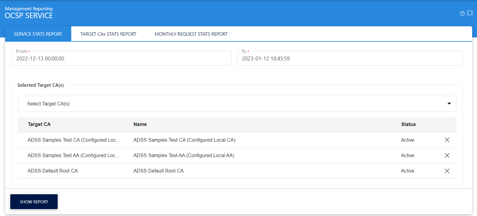 This report allows you to view which CA’s certificates are being validated the most and how this compares with other CAs registered within ADSS Trust Manager. Simply select the date range and press the Show Report button: