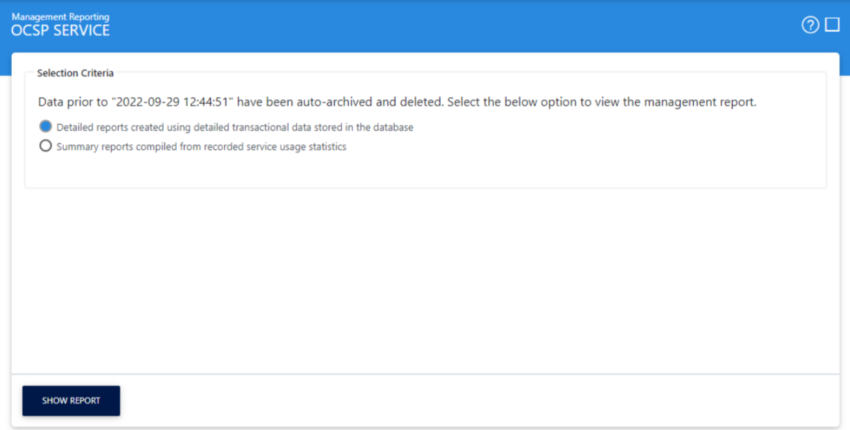 Service statistical reports are generated based on the entire history of ADSS Server's data no matter if the transactions have been archived or were not logged in the database. OCSP Service shows the following options to view the Management Reporting.