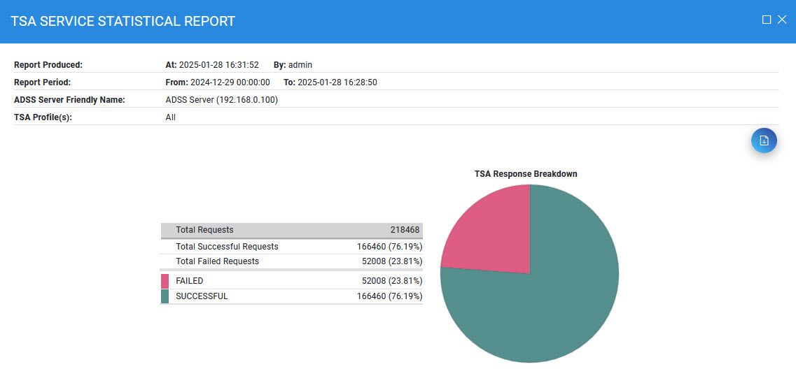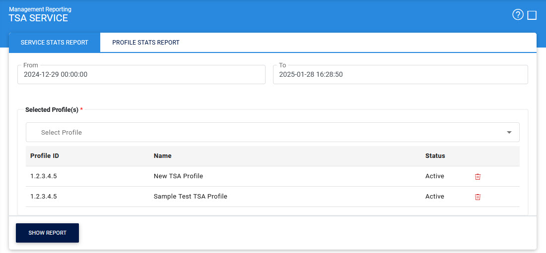 Select a particular TSA profile for which you want to see the statistics otherwise choose ALL option. By pressing the Show Report button the screen will be refreshed to show you the results concerning the number of success and failed transactions during that date range. |