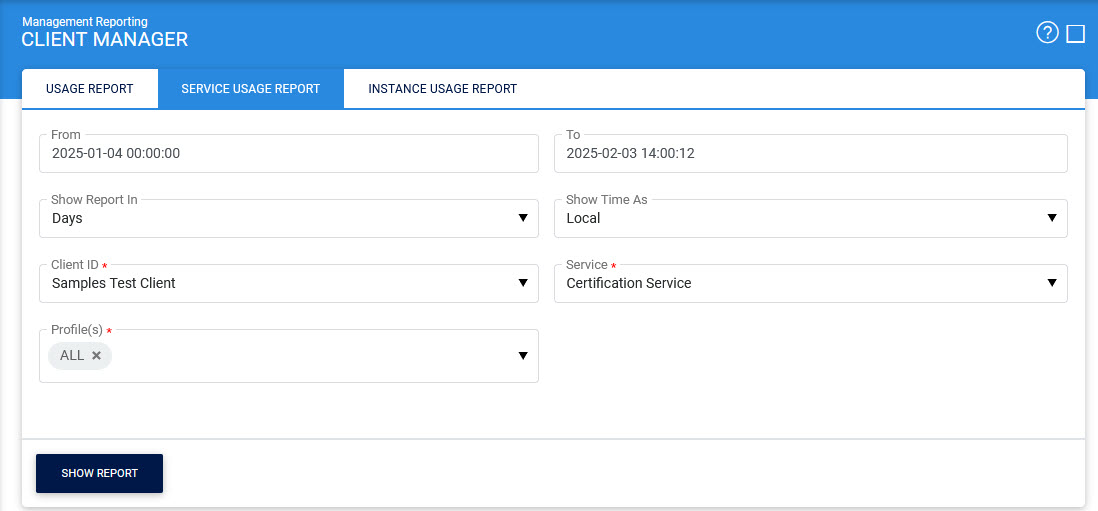 The Service Usage Report will display the usage report for the selected service along with its configured profiles. Clicking on the Service Usage Report tab displays the following screen: