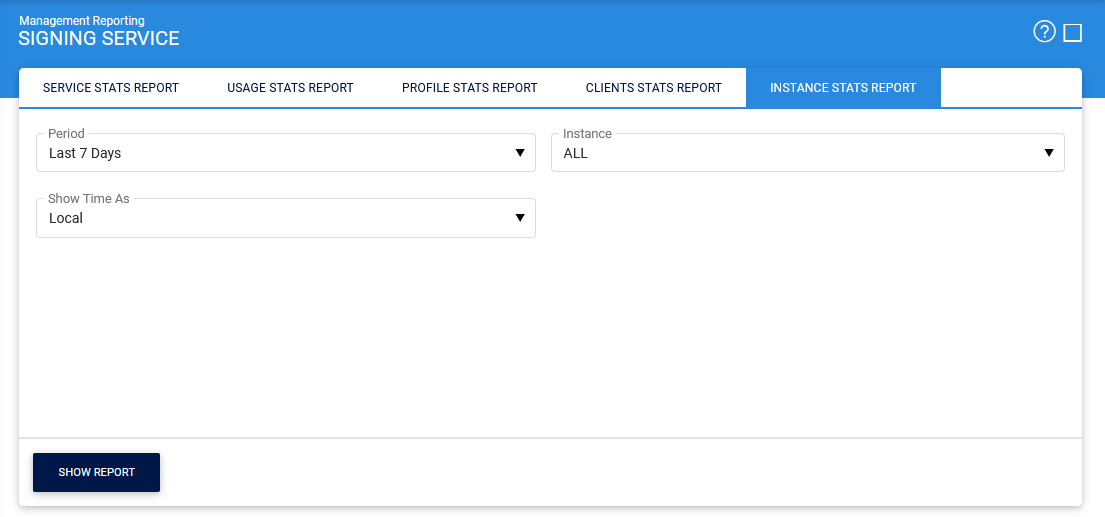 The Instance drop-down will contain the list of all Signing Services instances for a particular instance to be selected. If we want the report to be generated for all the instances, we simply need to select 'All' option available in Instance drop-down. |
